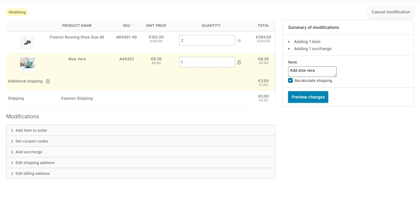 Once you have made the desired modifications, you preview the changes including the price difference.